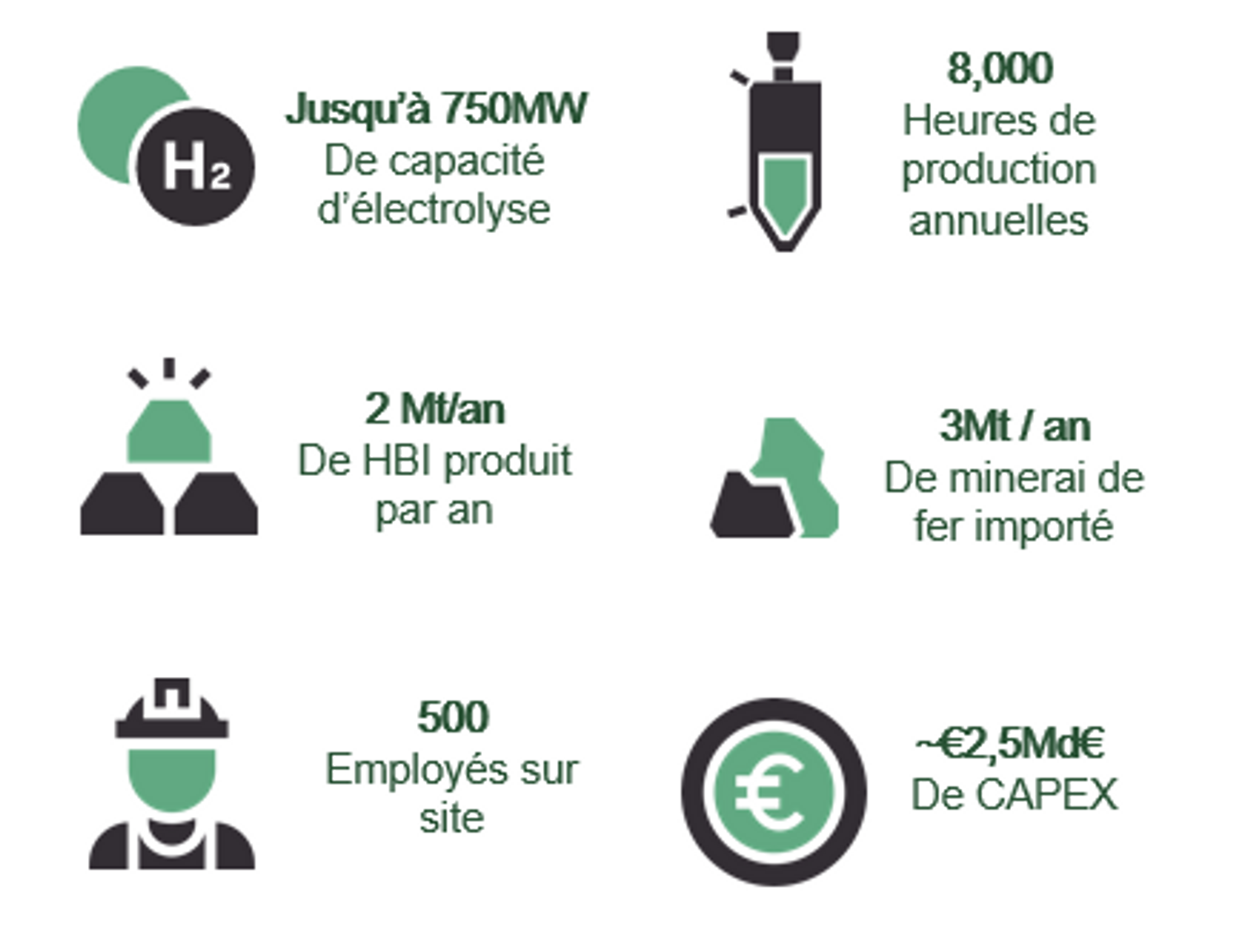 - GravitHy sera également le premier projet à intégrer la production sur site et l’utilisation dans son procédé d’hydrogène bas-carbone qui viendrait remplacer le gaz naturel utilisé dans le procédé traditionnel de réduction directe. La capacité installée des électrolyseurs pourrait aller jusqu'à 750 MW, ce qui en ferait la plus importante unité jamais installée en France, et permettant de produire annuellement jusqu’à 120 000 tonnes d’hydrogène bas-carbone.