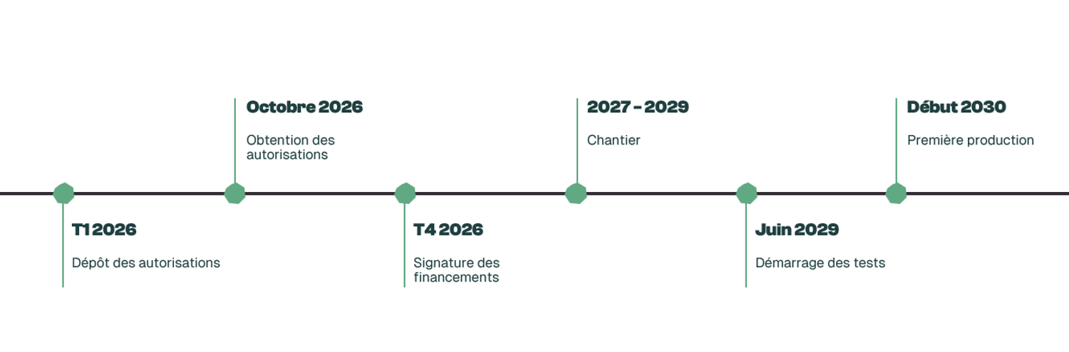 Après la phase de concertation préalable et les procédures d’autorisation nécessaires, le démarrage de la construction pourrait intervenir en 2027 pour un démarrage des tests en 2029.